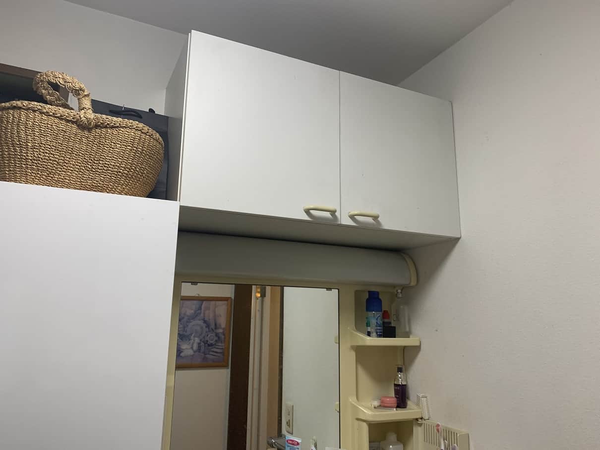 以前に使っていた洗面は陶器製のボールに下部収納は観音開きの開き扉収納、ミラー部分もオープンな棚収納タイプ